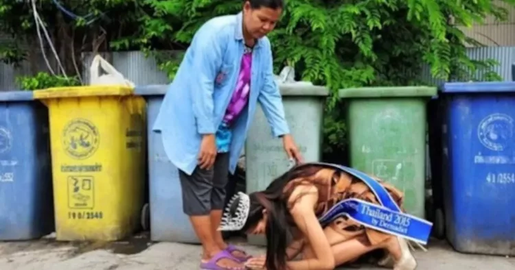 Fata tânără și frumoasă din imagine care îngenunchează lângă tomberoane este Khanittha ‘Mint’ Phasaeng (17 ani), și este din Thailanda. Ea a câștigat concursul de frumusețe „Miss Uncensored News Thailand 2015”, dar imediat după victorie, fata a plecat în orașul natal. De ce? Pentru a-i mulțumi mamei sale pentru că i-a dat viață, încredere și susținere pentru a ajunge atât de departe.